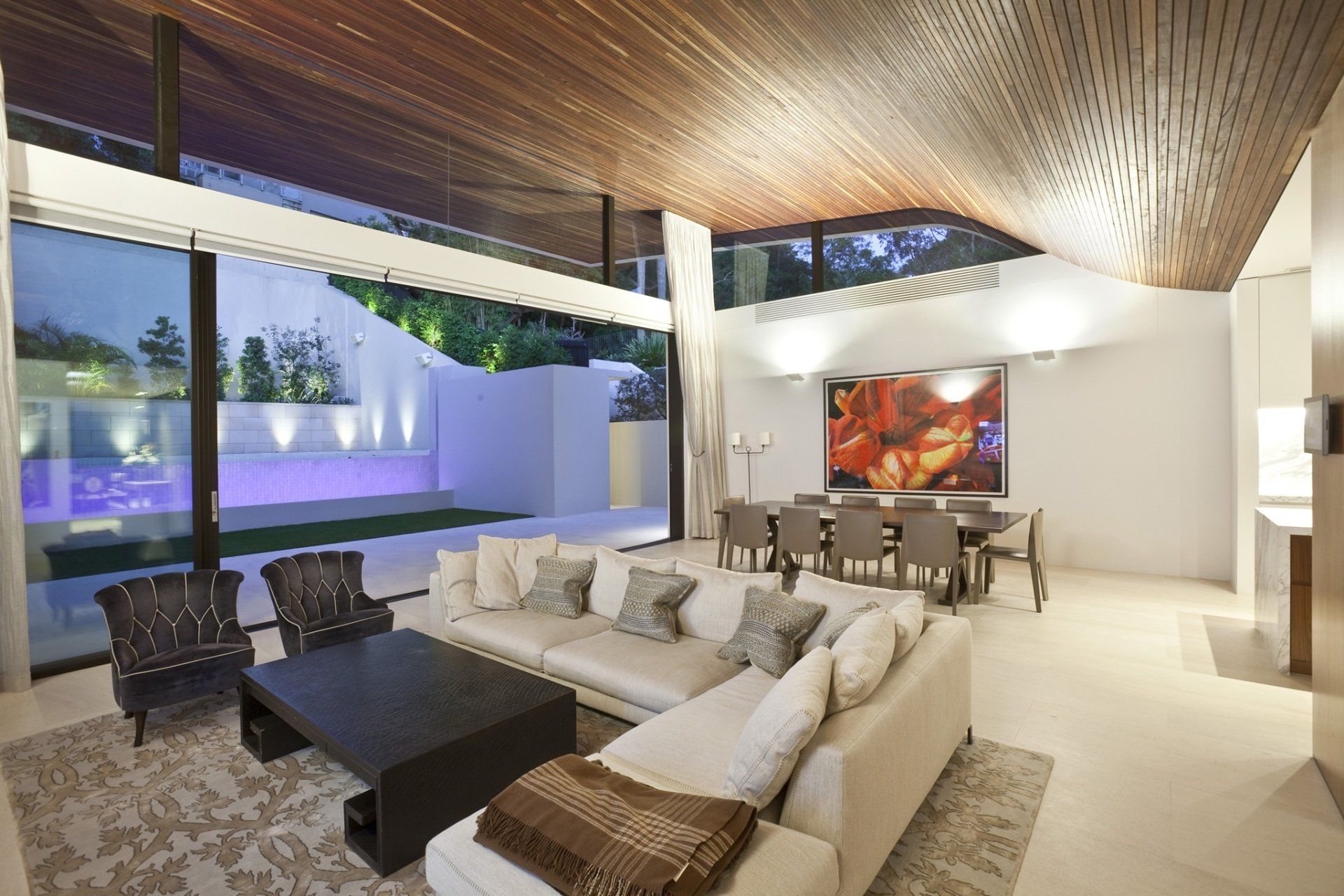 The pinnacle of this high-end stylish residence is the highly detailed and dramatic curved roof with timber battens applied to the soffit, which arcs over the living areas looking out onto the rear yard, opening them up to the sky.